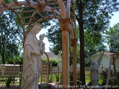 The Marian garden between Our Lady of the Angels church and the rectory makes a nice destination. Today, I sat on one of the benches for several minutes, enjoying the flowers, statues, sunlight bird songs: and the sound of a chain saw being used across the street.