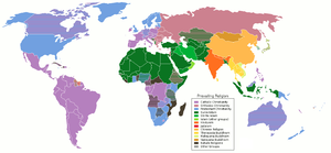 The unreadably small map up there links to a discussion of religious demographics in a Wikipedia article. The point is that folks in different parts of the world do tend to follow one religion more than other faiths. Which is probably where notions like 'Buddhists live in Japan' come from.